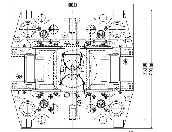 兩套模胚的雙色模具,具有兩個完全相同的后模,而兩個前模型腔是不同的,用于注射不同的物料。這就要求兩套模胚完全相同,由于需要互換配合,模胚需要具備很高的精度。一般要求模具的加工精度在0.01以內(nèi)。注意模胚的導(dǎo)柱導(dǎo)套孔仍然需要基準(zhǔn)角偏置,以防加工時出錯,和普通單色模具一樣。另外一點需要注意的是模具必須設(shè)計成三板模的形式,在一次注塑后,二次注塑前,水口料需要及時分離。